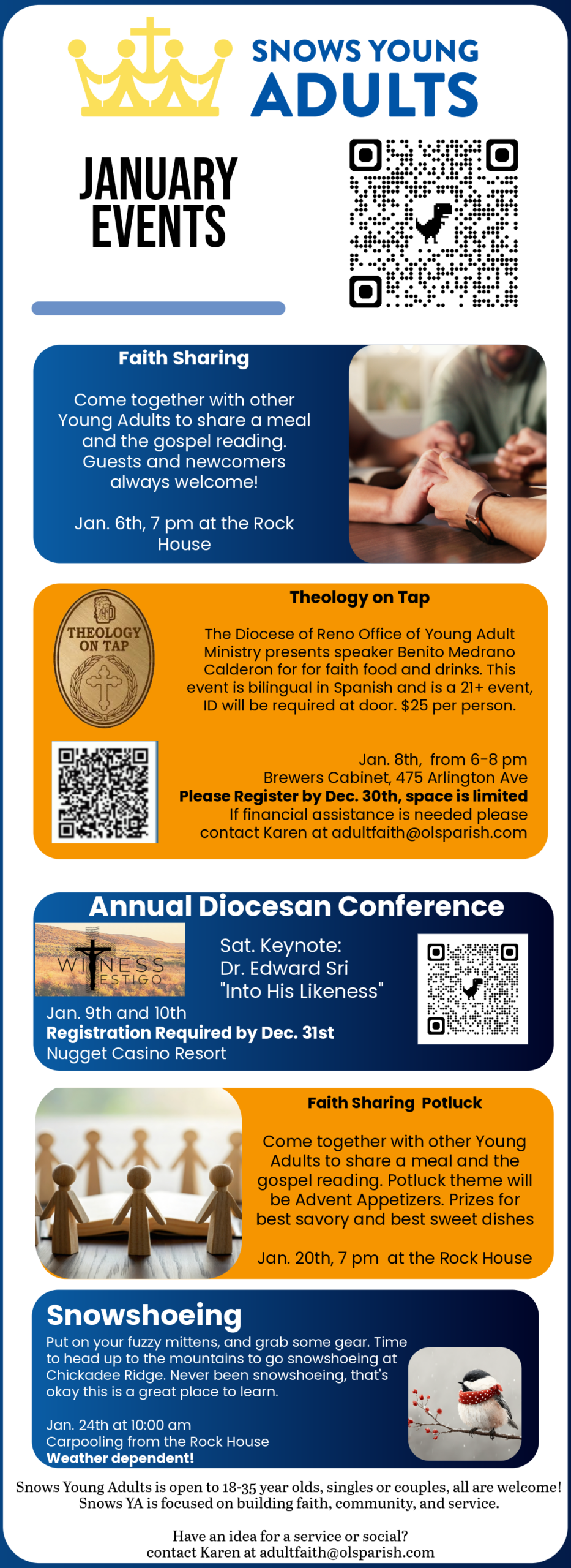 Our Lady of the Snows has a thriving Young Adult ministry that offers opportunties for prayer, service and fun. We have two groups which intermingle. One groups tends for the College aged persons (married and single) whereas the other group, ARC, tends to be families with kids.